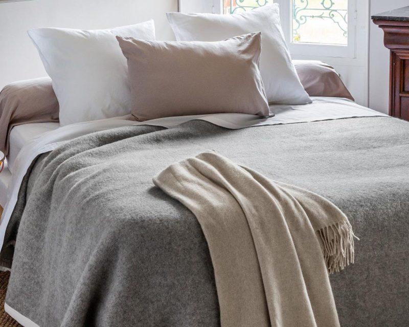 La couverture VOLNAY est tissée et confectionnée en FRANCE, en pure laine vierge 500gr/m2 et possède le label Woolmark.