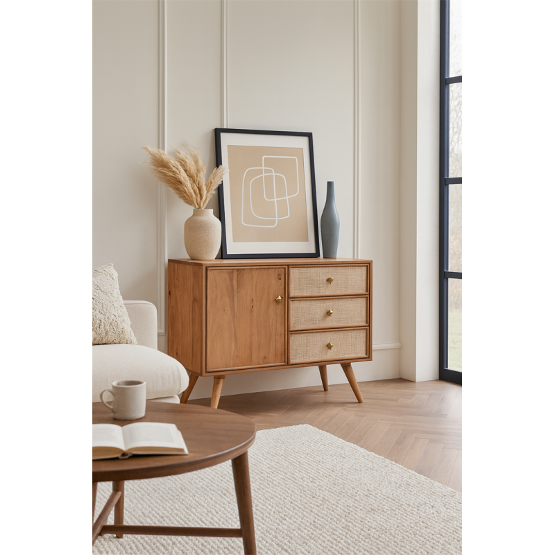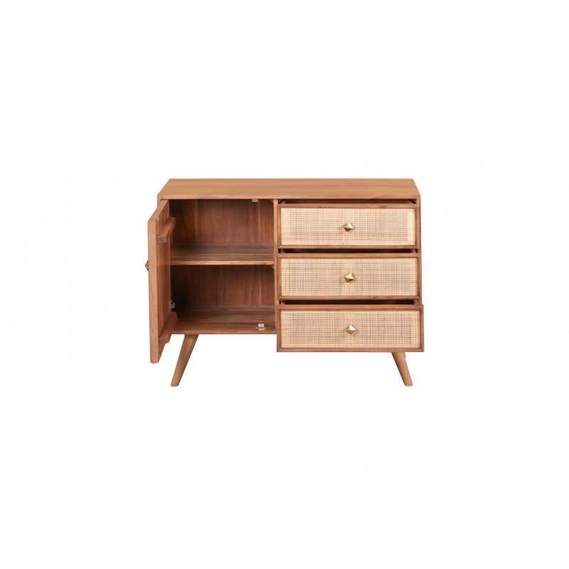 Caisson, porte et tiroirs et piètement en acacia, façades de tiroirs en acacia et plaqué cannage, finition teinte couleur teck, vernis nitro cellulosique (pieds démontés), certifié FSC