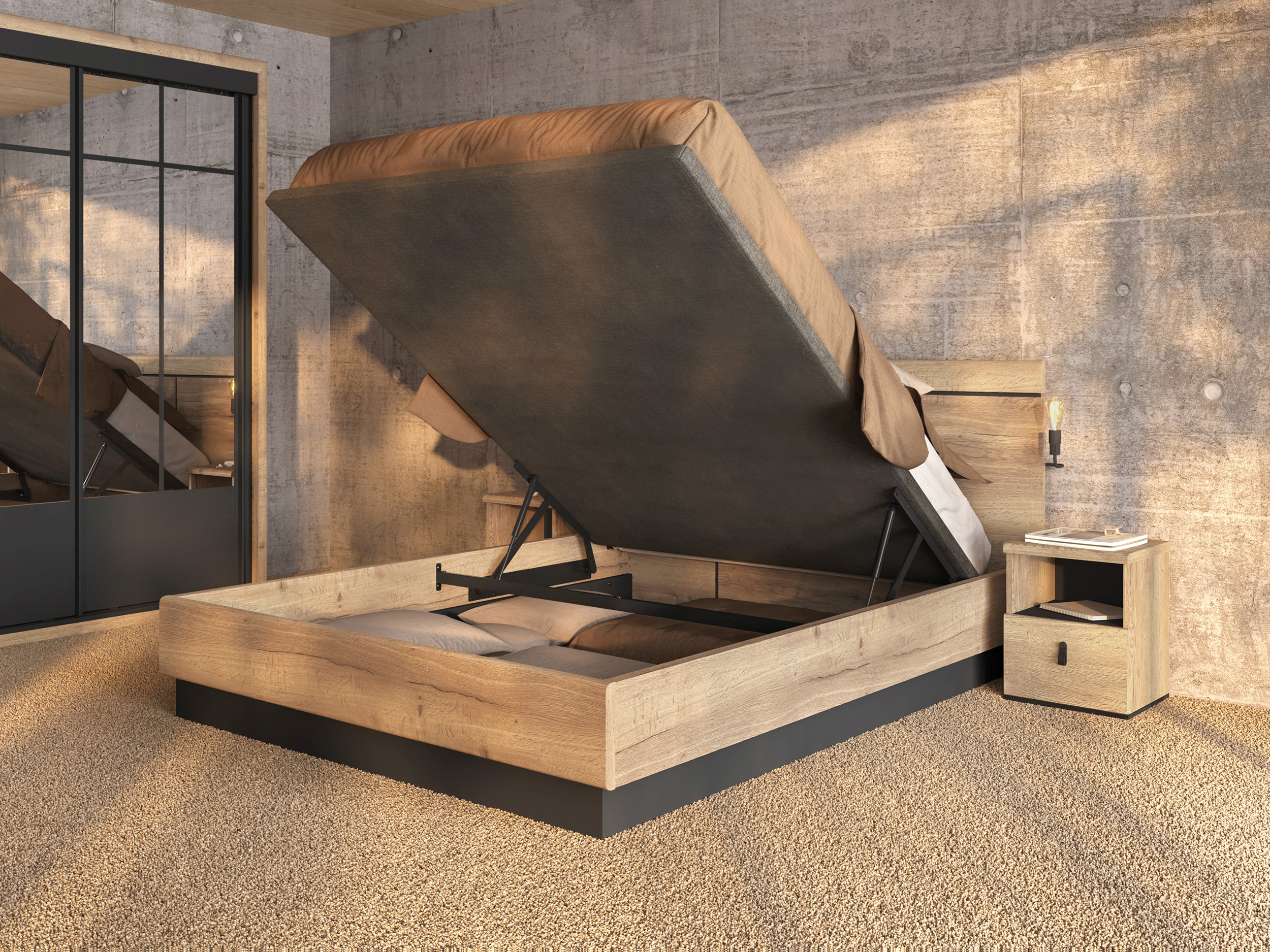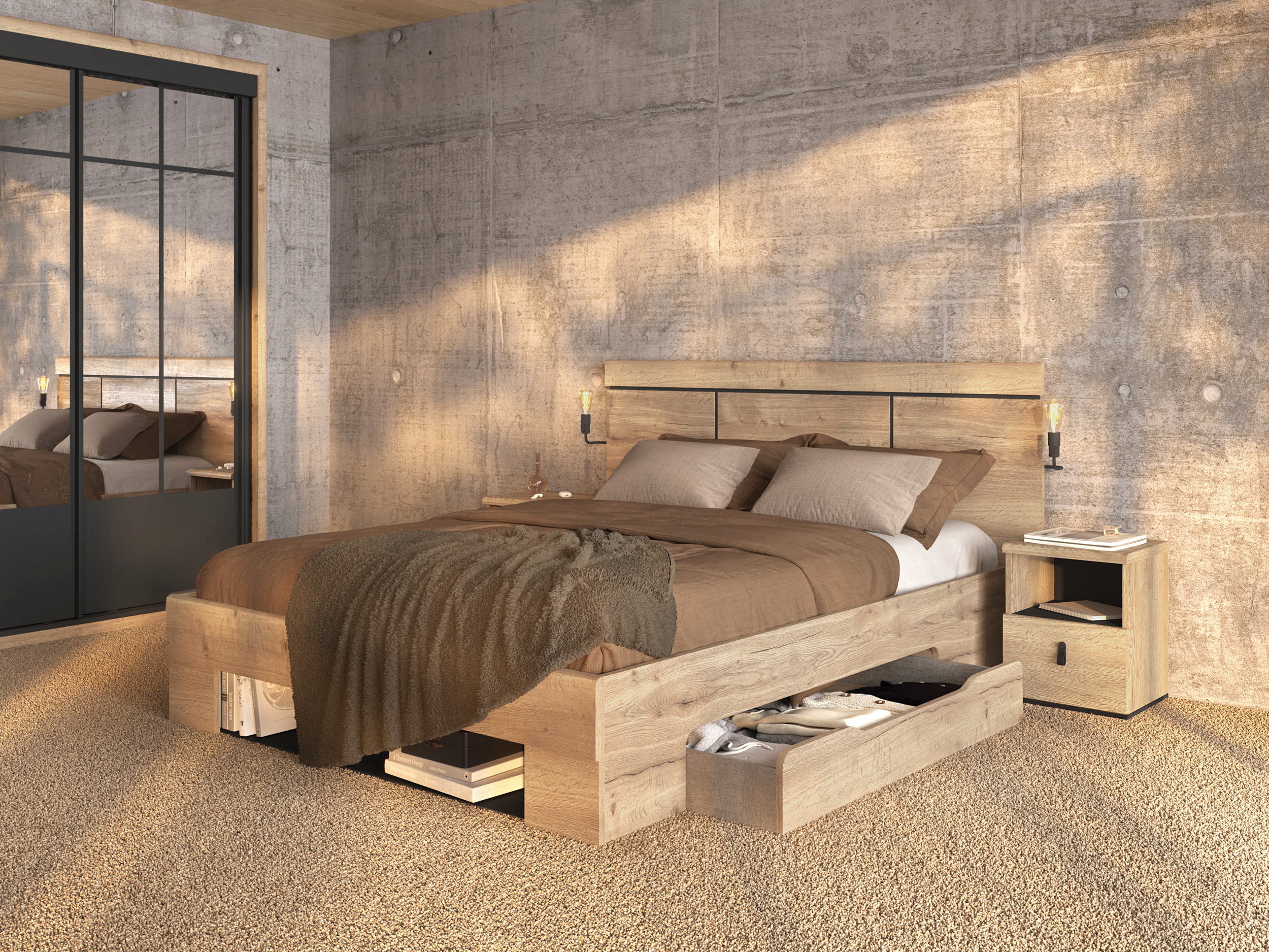 Le dressing composable permet de créer un espace parfaitement adapté à vos besoins, tandis que le lit 2 personnes et les meubles assortis insufflent une atmosphère chaleureuse et pleine de caractère.