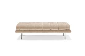 Fonctionnalité et recherche esthétique trouvent leur union parfaite dans le lit double Muzzle. Sa grande tête, définie par des profilés en métal, est revêtue de velours gris platine noble, dont le capitonnage exclusif crée un jeu élégant d’ombre et de lumière en trois dimensions. Placé sur une structure en bois solide, ce modèle se distingue par son tour de lit rembourré et revêtu du même velours.